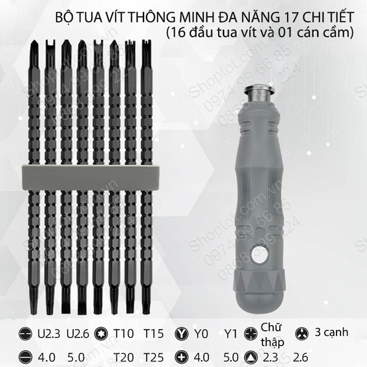 Bộ tua vít đa năng thông minh 17 chi tiết được thiết kế thông minh nhiều chức năng với đầu tua vít dễ dàng thay đổi chiều dài. Với 16 đầu khác nhau giúp vặn được hầu hết các loại vít nhỏ có trên thị trường