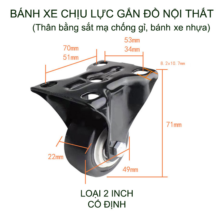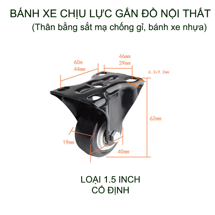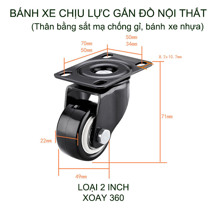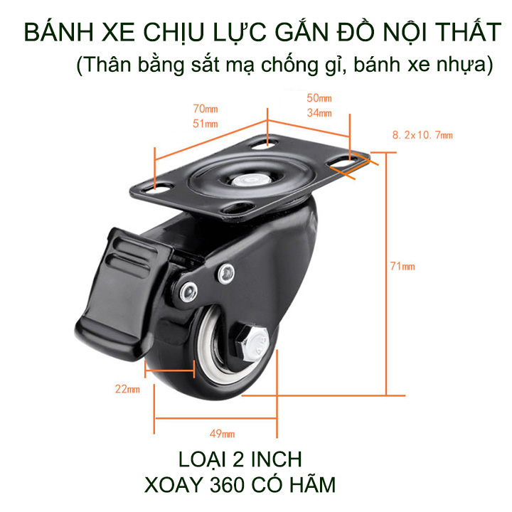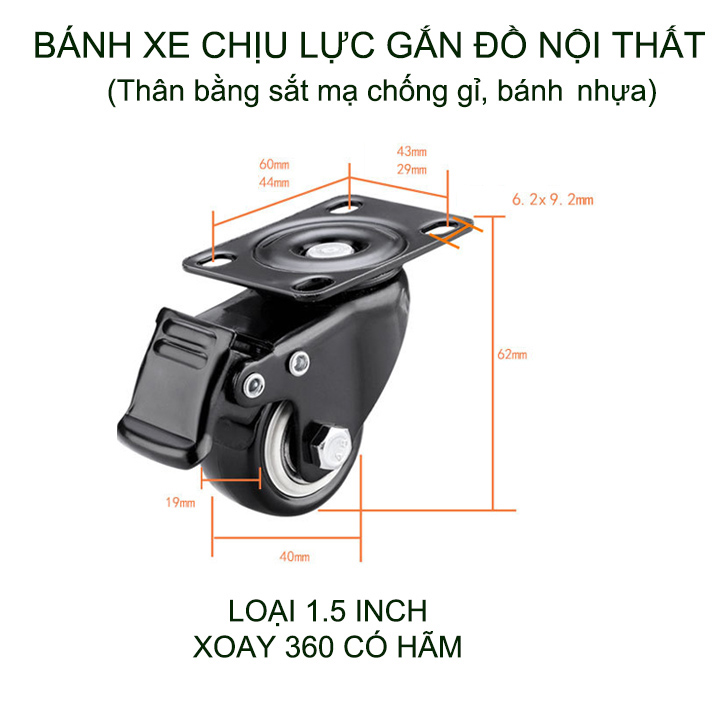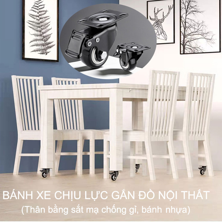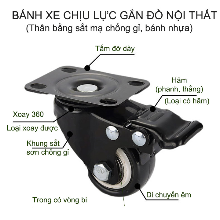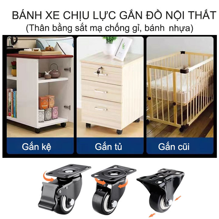 Ứng dụng: Dùng gắn xe đẩy, đồ nội thất nặng tới 60-80kg, kệ các loại