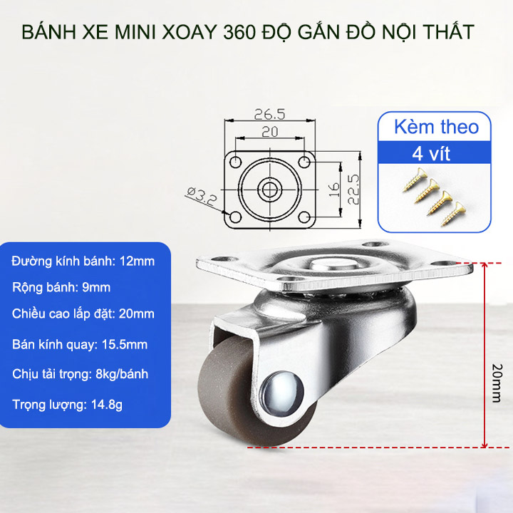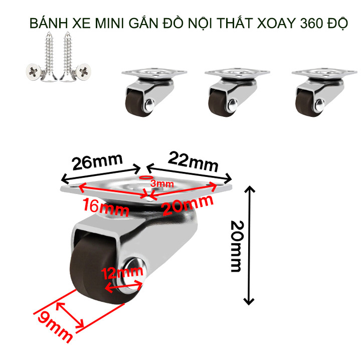 Kích thước: Đường kính bánh 12mm, cao 20mm (xem chi tiết)