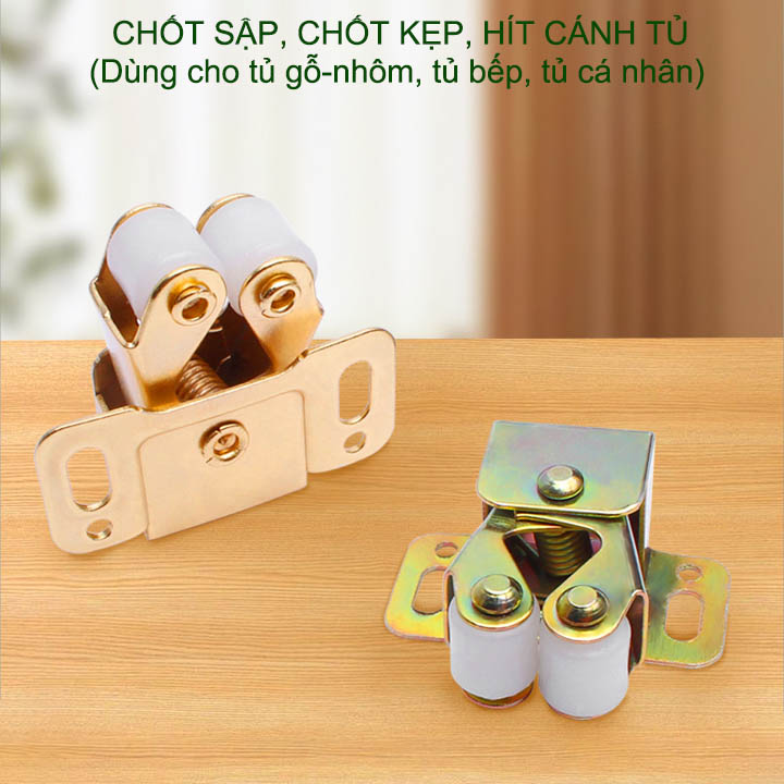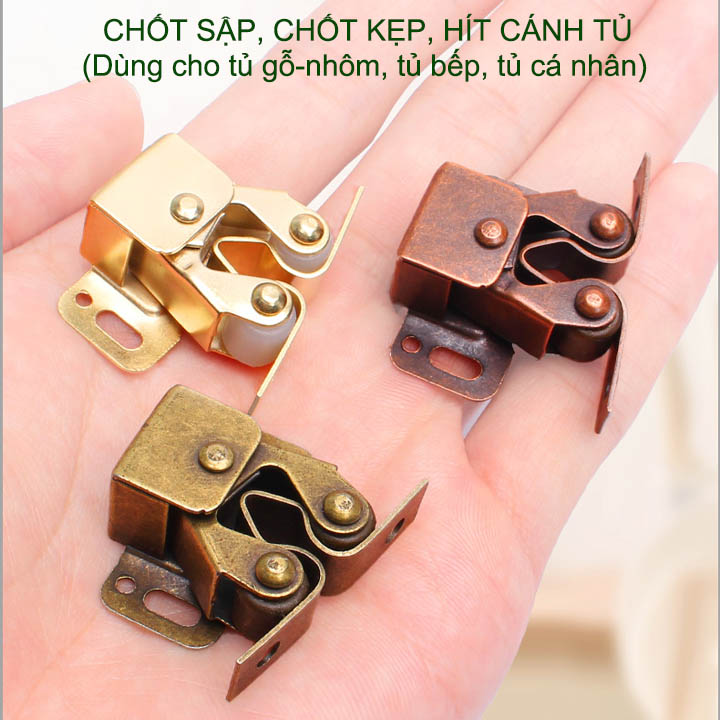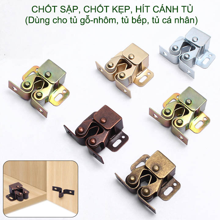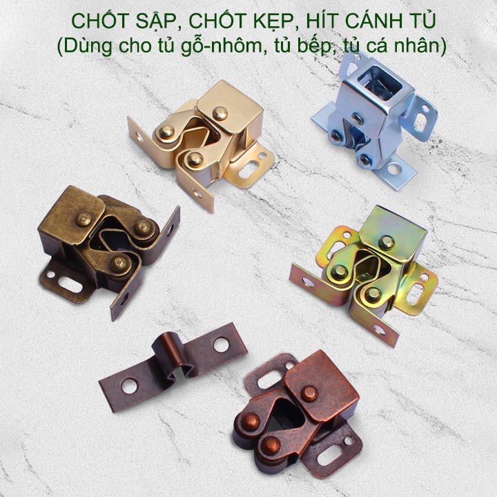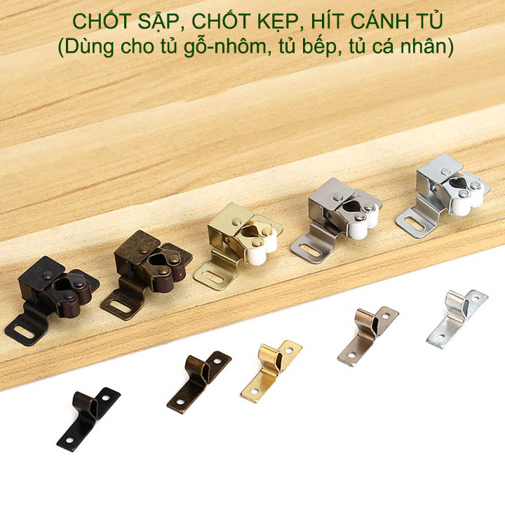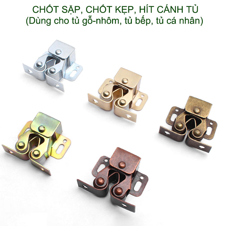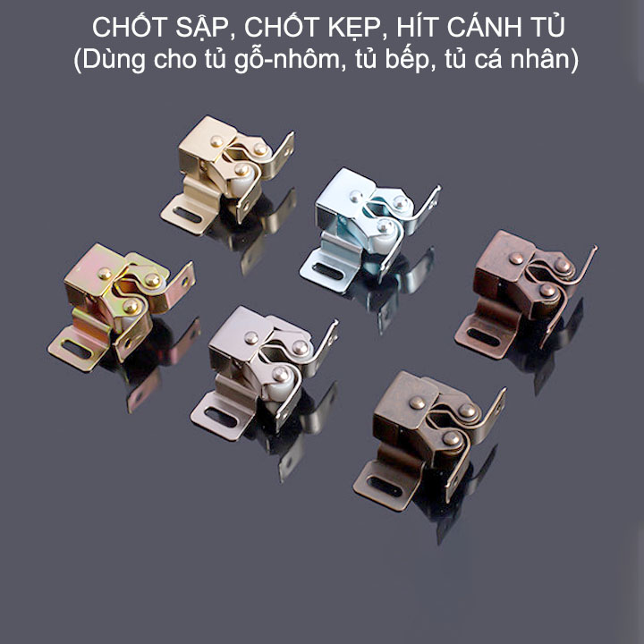 chốt sập, hít, kẹp cánh tủ, cánh cửa được thiết kế nhỏ gọn, đẹp, chắc chắn làm bằng sắt mạ rất bền. Có 02 bánh xe nhựa giúp giữ cánh tủ chắc chắn, đồng thời có nhiều màu cho khách tùy chọn