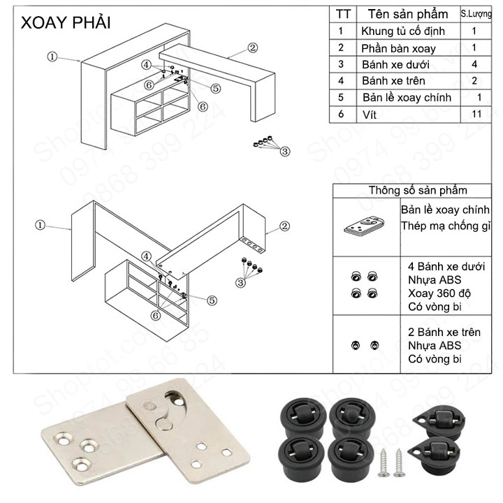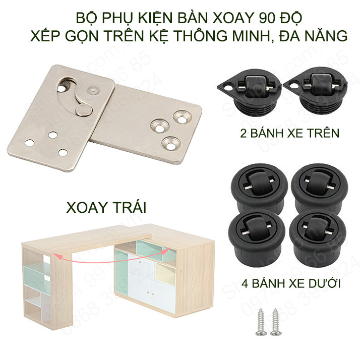 Bộ sản phẩm gồm: 01 bản về xoay chuyên dụng, 4 bánh xe dưới, 2 bánh xe trên (xem thêm hình ảnh kèm theo)